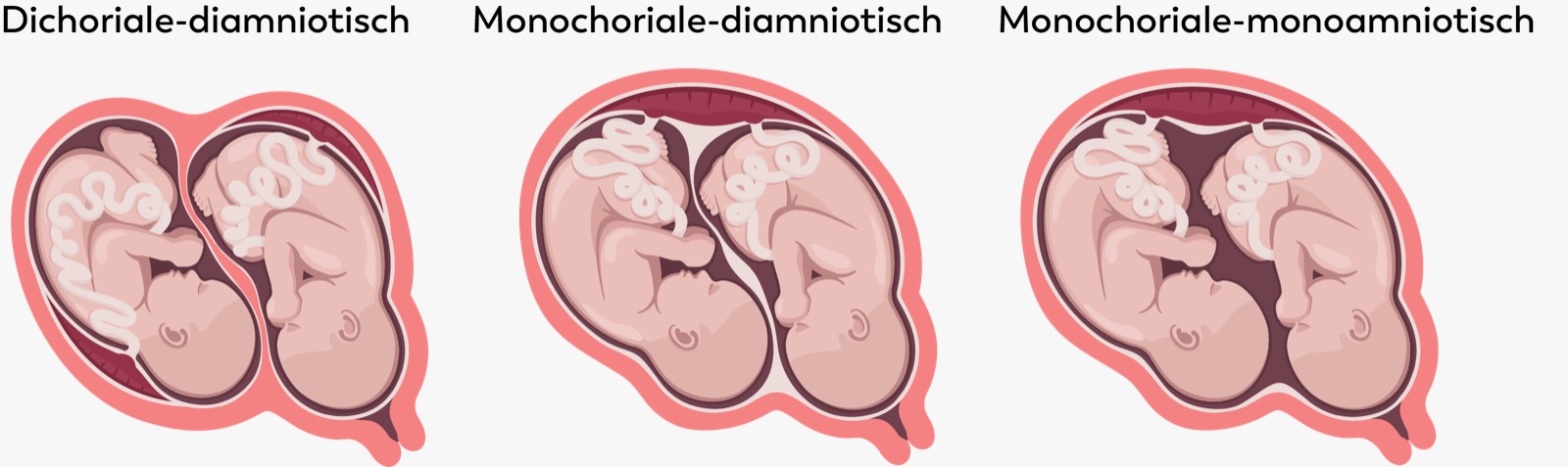 We bespraken al het verschil tussen de eeneiige en de twee-eiige tweeling. Ongeveer tweederde van alle tweelingen is twee-eiig, eenderde is eeneiig. Drielingen zijn meestal drie-eiig. In de baarmoeder bevindt zich rond het vruchtwater een vruchtzak. Deze vruchtzak bestaat uit een dun binnenste vlies, het amnion, en een dikker buitenste vlies, het chorion. Bij een twee-eiige (en soms ook bij een eeneiige) tweeling zitten er altijd rond ieder kind twee vruchtvliezen. Het tussenschot tussen het vruchtwater van beide kinderen bestaat zo uit vier vliezen. Men spreekt dan van een dichorialediamniotische tweeling.Bij een eeneiige tweeling is het ook mogelijk dat er maar één buitenvlies is (chorion) en dat het tussenschot alleen uit twee dunne binnenvliezen (amnion) bestaat. De kinderen liggen dan wel in twee vruchtzakken. Dit noemt men een monochoriale-diamniotische tweeling.Slechts zelden (1%) is er bij een eeneiige tweeling geen tussenschot en liggen beide kinderen in één vruchtholte. Dit wordt dan een monochoriale-monoamniotische tweeling genoemd.