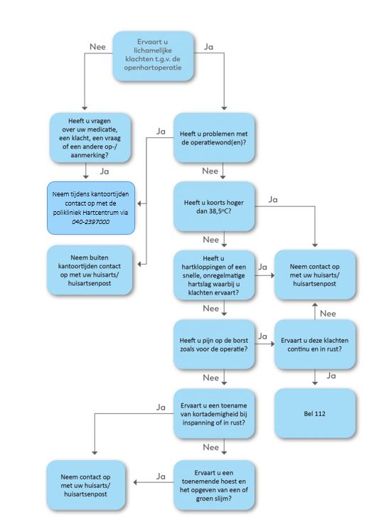 Hebt u als u thuis bent toch nog vragen? Dan kunt u deze bespreken met uw huisarts, met de hartchirurg of met de cardioloog op de polikliniek.